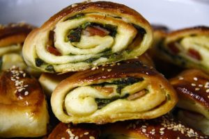 Hozzávalók: tészta: 80 dkg liszt, 1 evőkanál só, 1,5 dl étolaj, 5 dl langyos tej, 5 dkg élesztő. Krém: 25 dkg margarin,1 csokor medvehagyma, 20 dkg húsos szalonna, 3 tojás sárgája, 1 evőkanál só. Tetejére: 1 evőkanál tejföl, 1 tojás sárgája, szezámmag (vagy sajt).
