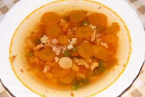 A zöldségféléket megtisztítjuk. A sárgarépát és petrezselymet karikákra vágjuk.