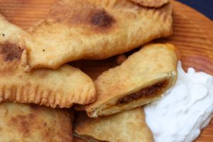 A tésztát fél cm vastagra kisodorjuk, és nagyobb téglalapokat vágunk belőle. Közepükbe egy evőkanálnyi húsos tölteléket halmozunk, majd felhajtjuk a tésztát. A széleit gondosan lenyomkodjuk, legjobb, ha villával is megismételjük – a tészta mindkét oldalán – a műveletet. Így biztosan nem fog kifolyni a töltelék.