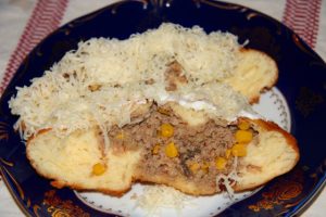 Hozzávalók: 1 kg liszt, 5 dkg élesztő, 1 teáskanál cukor, 1 teáskanál só, 4,5 dl aludttej, 3 tojás, 3 dl tej, fél dl étolaj. Töltelék: 2 evőkanál zsír, 1 kg darált sertéshús, 15 dkg gomba, 15 dkg kukorica, 15 dkg vöröshagyma, só, 1 kávéskanál őrölt feketebors, 2 dl tejföl, 15 dkg reszelt sajt, 1 evőkanál paprikakrém, 1 paradicsom. A sütéshez 1 liter étolaj.