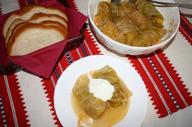 Hozzávalók: 25 dkg rizs, 1 kg darált sertéshús, 3 evőkanál só, 1 teáskanál őrölt feketebors, 30 dkg füstölt szalonna, 2 vöröshagyma, 1 fej fokhagyma, 7 dl paradicsomlé, 1 dl ecet, tormalevél, másfél evőkanál őrölt paprika.