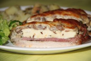 Hozzávalók: 50 dkg sertéskaraj, 20 dkg füstölt sonka, 20 dkg zöldfűszeres, vagy köményes sajt, 10 dkg trappista sajt, 50 dkg szegfűgomba, 2 vöröshagyma, egy deci étolaj, 2 dl főzőtejszín, 2 evőkanál liszt, só, 1 kávéskanál őrölt feketebors, néhány szál kakukkfű, petrezselyem, zeller zöld. A körethez: 1 kg krumpli, 1 csokor bazsalikom, 10 dkg vaj, só.