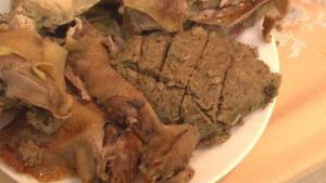 A levest a cérnametélttel és a tálba szedett főtt zöldségekkel kínáljuk. Második fogás a hús és a töltelék lesz, amit meggymártással együtt teszünk az asztalra.