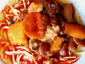 Hozzávalók: (12 főre) 1 kg szárazbab, egy hátsó, és egy első csülök, 6 fej vöröshagyma, 10 sárgarépa, 5 petrezselyem gyökere, 1 nagyobb zellergumó, só, 1 csokor petrezselyem zöldje, 4 zöldpaprika. A rántáshoz: 2 evőkanál sertészsír, 2 evőkanál liszt, 2 gerezd fokhagyma, 2 púpos evőkanál őrölt paprika. A tálaláshoz metélttészta.