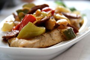 A szép fehér húsú vicsegét fokhagymás galuskával, és színes lecsóval tálaljuk.