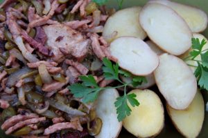 Hozzávalók: 1 kg rövidkaraj, 25 dkg füstölt szalonna, 25 dkg füstölt kolbász, 1 üveg ecetes uborka, őrölt feketebors, só, a sütéshez sertészsír. Köret: 1,5 kg burgonya, só, 1 evőkanál zsír.