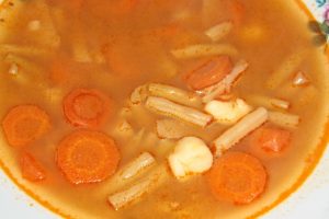 Egy lábasban zsírt olvasztunk, és ezen megfonnyasztjuk a zöldségeket. Belereszeljük, vagy apróra szelve hozzáadjuk a fokhagymát is. Összesütjük, megszórjuk liszttel, majd őrölt paprikával, és felengedjük egy-másfél liter vízzel. Tíz perc múlva beledobhatjuk a paradicsomot és a zöldbabot, és ezekkel együtt készre főzzük.