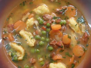 Hozzávalók: 1 fej vöröshagyma, fél dl étolaj, 3 sárgarépa, 1 petrezselyem gyökere, 15 dkg rókagomba, 20 dkg zöldborsó, 1 paprika, 1 szelet zeller, 1 paradicsom, kis csokornyi lestyán, 1 csokor petrezselyem zöldje, 2 teáskanál só. A rántáshoz: 3 evőkanál étolaj, 2 evőkanál liszt, 1 teáskanál őrölt fűszerpaprika. A vajas galuskához: 1 tojás, 1 mokkáskanálnyi vaj, néhány evőkanál liszt.