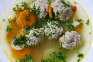 Amikor a levesünk felforrt, vizes kézzel diónyi húsgombócokat helyezünk bele, és az egészet készre főzzük.