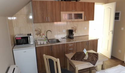 On the ground floor of the new building, there is a spacious wellness area with a Finnish and infrared sauna, a hot tub, a jacuzzi, and here guests also can play ping-pong. We can provide a barrier-free room with a separate entrance for people with reduced mobility. There are 5 double rooms with double beds on the first floor. Each is apartment has a well-equipped kitchenette and bathroom with shower and toilet. A garden kitchen is connected to the new building too. The accommodation is air-conditioned.