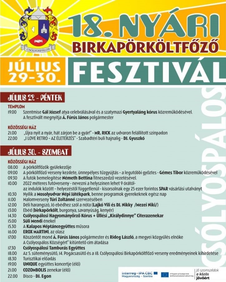 18. Nyári Birkapörköltfőző Fesztivál Csólyospáloson. A település legnagyobb sport, kulturális és gasztronómiai eseményére szeretettel várnak minden érdeklődőt 2022. július 29-30-án. A rendezvény díjtalan!,18. Nyári Birkapörköltfőző Fesztivál Csólyospáloson. A település legnagyobb sport, kulturális és gasztronómiai eseményére szeretettel várnak minden érdeklődőt 2022. július 29-30-án. A rendezvény díjtalan!