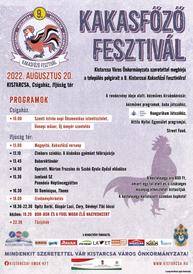 IX. Kistarcsai Kakasfőző Fesztivál 2022. augusztus 20-án 13.00-tól Kistarcsán az Ifjúság téren. Fergeteges színpadi fellépőkkel, gyerekprogramokkal készültünk. Várjuk családok, baráti társaságok, intézmények, egyesületek jelentkezését kakasfőző versenyünkre augusztus 12-ig!,IX. Kistarcsai Kakasfőző Fesztivál 2022. augusztus 20-án 13.00-tól Kistarcsán az Ifjúság téren. Fergeteges színpadi fellépőkkel, gyerekprogramokkal készültünk. Várjuk családok, baráti társaságok, intézmények, egyesületek jelentkezését kakasfőző versenyünkre augusztus 12-ig!