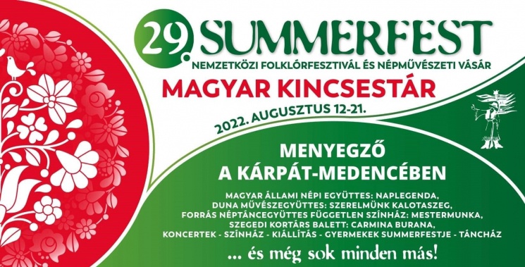 XXIX. Summerfest, Nemzetközi Folklórfesztivál és Népművészeti Vásár Százhalombattán 2022. augusztus 12-21. között.