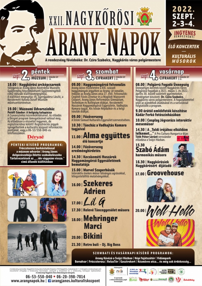A látogatók nagy örömére szeptember első hétvégéjén újra megrendezzük a Nagykőrösi Arany-Napokat. Igyekeztünk minden korosztály számára minőségi programokat kínálni, így nagyon bízunk benne, hogy szeptember első hétvégéjén az élmények mindenkire rátalálnak Nagykőrösön. Sok szeretettel várunk minden kedves kikapcsolódni vágyó érdeklődőt a XXII. Nagykőrösi Arany-Napokra.,A látogatók nagy örömére szeptember első hétvégéjén újra megrendezzük a Nagykőrösi Arany-Napokat. Igyekeztünk minden korosztály számára minőségi programokat kínálni, így nagyon bízunk benne, hogy szeptember első hétvégéjén az élmények mindenkire rátalálnak Nagykőrösön. Sok szeretettel várunk minden kedves kikapcsolódni vágyó érdeklődőt a XXII. Nagykőrösi Arany-Napokra.