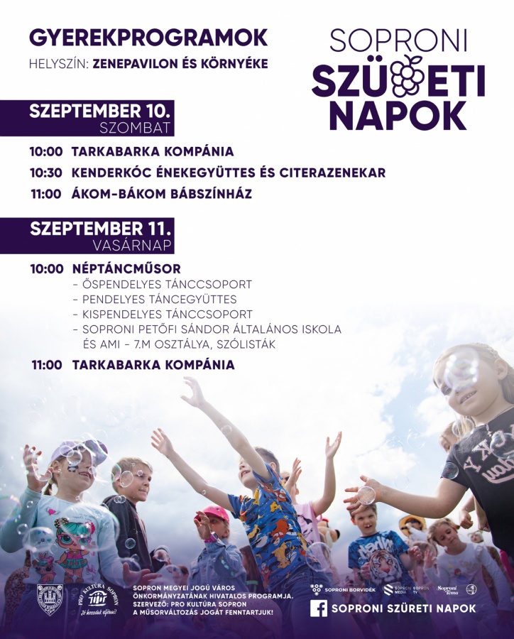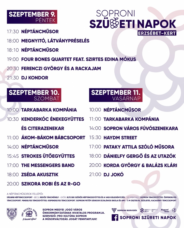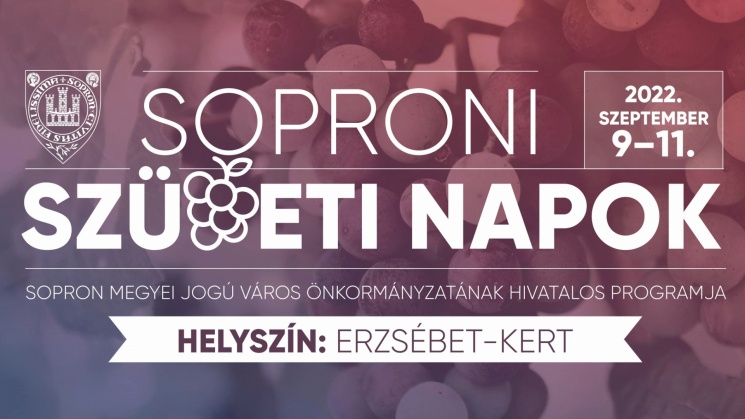A Soproni Szüret hagyományosan a szüreti időszak kezdő eseménye és a nyári turisztikai szezon búcsúztatása Sopronban is. Rendezvényünkön a helyi borászatok kínálatán túl finom ételekkel, valamint változatos háttérzenével teremtjük meg a jó hangulatot a baráti beszélgetésekhez, kísérőprogramokhoz. Koccintsunk közösen szeptember második hétvégéjén a soproni borosgazdákra és a jó termésre Sopron egyik legszebb parkjában, az Erzsébet-kertben! A háromnapos esemény ingyenesen látogatható.,A Soproni Szüret hagyományosan a szüreti időszak kezdő eseménye és a nyári turisztikai szezon búcsúztatása Sopronban is. Rendezvényünkön a helyi borászatok kínálatán túl finom ételekkel, valamint változatos háttérzenével teremtjük meg a jó hangulatot a baráti beszélgetésekhez, kísérőprogramokhoz. Koccintsunk közösen szeptember második hétvégéjén a soproni borosgazdákra és a jó termésre Sopron egyik legszebb parkjában, az Erzsébet-kertben!