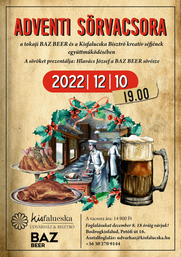 2022. december 10.ADVENTI SÖRVACSORA a tokaji BAZ BEER és a Kisfalucska Bisztró kreatív séfjének együttműködésében
