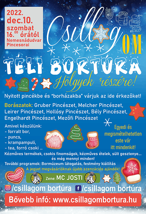 Gyere, tarts velünk az első női téli bortúrán, nehogy lemaradj és bánd, hogy nem voltál velünk! Finom borok, mézeskalács, sült gesztenye és még mennyi finomság. Különböző borokból készült forralt bor és forró tea is átmelegíti a lelkünket és a kezünket. Az este beköszöntével indul a zene.