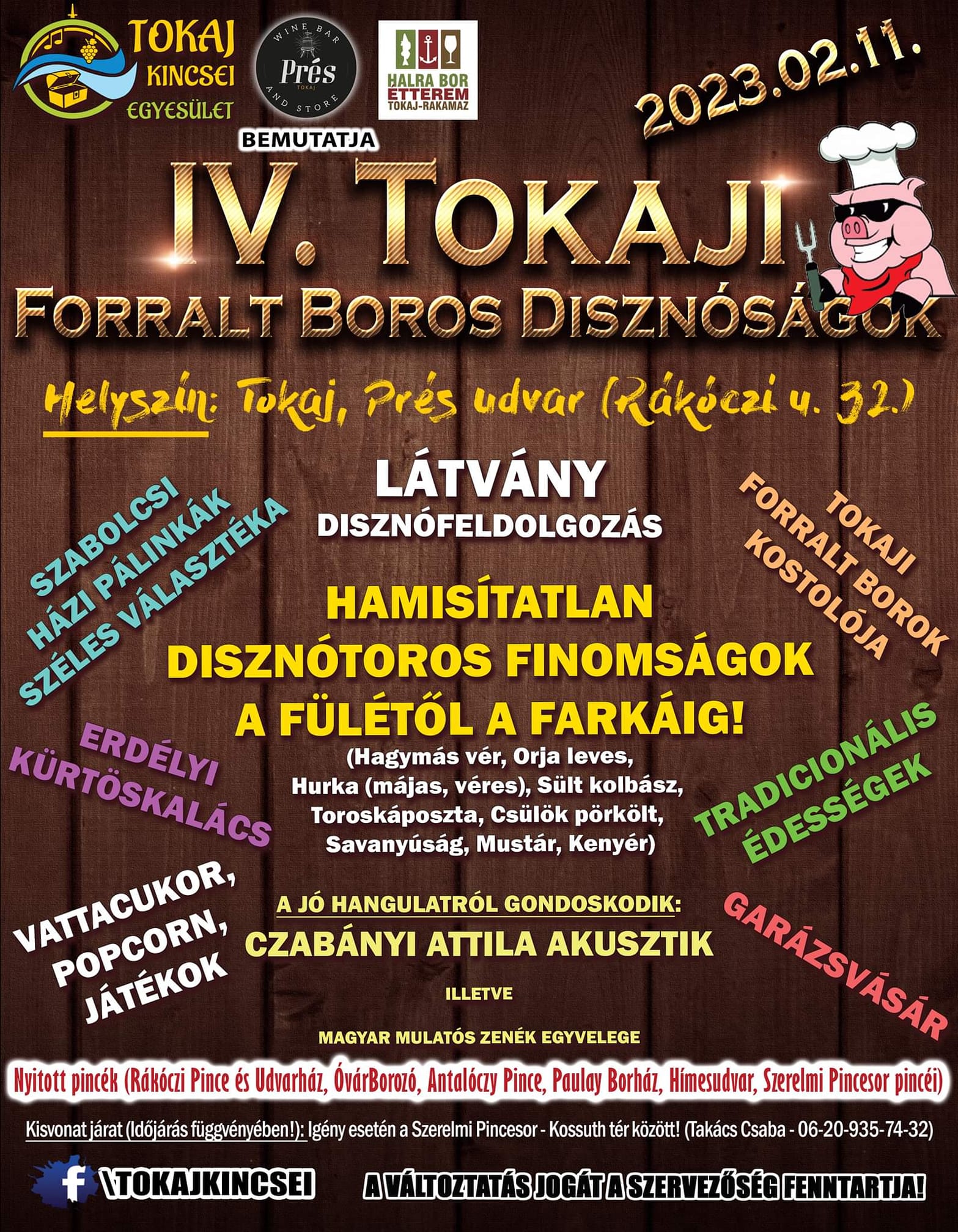 Tokaji Forralt Boros Disznóságok 2023. február 11-én, szombaton reggel 8 órától. Látvány disznótor, tradicionális böllérkedés, hamisítatlan disznótoros finomságok, különleges forralt borok, versenyek, gyermekprogramok, jókedv, jó zene várja a látogatókat.,Tokaji Forralt Boros Disznóságok 2023. február 11-én, szombaton reggel 8 órától. Látvány disznótor, tradicionális böllérkedés, hamisítatlan disznótoros finomságok, különleges forralt borok, versenyek, gyermekprogramok, jókedv, jó zene várja a látogatókat.,Tokaji Forralt Boros Disznóságok 2023. február 11-én, szombaton reggel 8 órától. Látvány disznótor, tradicionális böllérkedés, hamisítatlan disznótoros finomságok, különleges forralt borok, versenyek, gyermekprogramok, jókedv, jó zene várja a látogatókat.