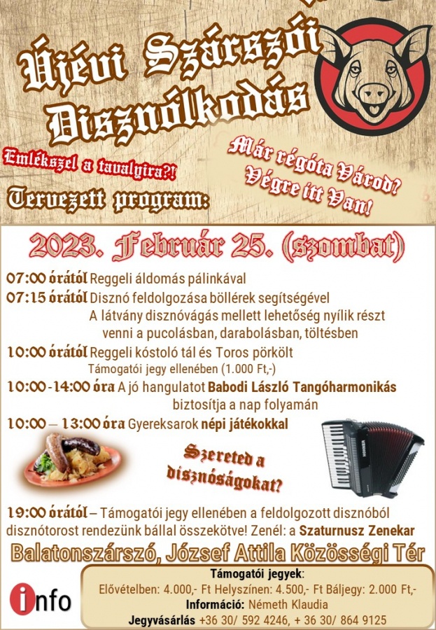 Látvány-disznóvágás, aktív részvétel a munkálatokban, játékok, disznótoros vacsora, valamint bál a balatonszárszói művelődési házban.,Látvány-disznóvágás, aktív részvétel a munkálatokban, játékok, disznótoros vacsora, valamint bál a balatonszárszói művelődési házban.,Látvány-disznóvágás, aktív részvétel a munkálatokban, játékok, disznótoros vacsora, valamint bál a balatonszárszói művelődési házban.