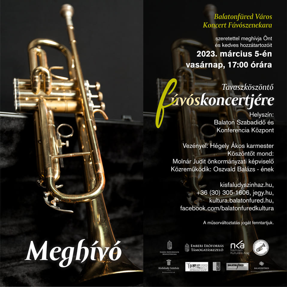 Balatonfüred Város Koncert Fúvószenekara szeretettel meghívja Önt és kedves hozzátartozóit Tavaszköszöntő Fúvóskoncertjére. Az idén 88 éves balatonfüredi fúvószenekar a város egyik kedvence. Ha elindulnak a Füredi utcákon, sétányokon, nagy, jókedvű zenekedvelő tömeg kíséri őket. Ezúttal hagyományos tavaszköszöntő koncertjükre invitáljuk a zenebarátokat, mely hgyományosan a Balaton Szabadidő és Konferencia Központban lesz.,Balatonfüred Város Koncert Fúvószenekara szeretettel meghívja Önt és kedves hozzátartozóit Tavaszköszöntő Fúvóskoncertjére. Az idén 88 éves balatonfüredi fúvószenekar a város egyik kedvence. Ha elindulnak a Füredi utcákon, sétányokon, nagy, jókedvű zenekedvelő tömeg kíséri őket. Ezúttal hagyományos tavaszköszöntő koncertjükre invitáljuk a zenebarátokat, mely hgyományosan a Balaton Szabadidő és Konferencia Központban lesz.