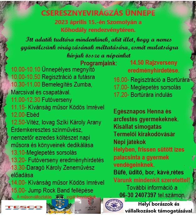 A szomolyai rövid szárú fekete cseresznye világszerte híres. A településen immár hagyományosan minden esztendőben megünnepeljük ennek a csodálatos gyümölcsnek az ünnepét. Mi már készülünk. Fussál velünk az egészségedért! Szórakozzunk együtt az élményekért! Legyél a vendégünk és legyünk mnindannyian egymás élménye és emléke.,A szomolyai rövid szárú fekete cseresznye világszerte híres. A településen immár hagyományosan minden esztendőben megünnepeljük ennek a csodálatos gyümölcsnek az ünnepét. Mi már készülünk. Fussál velünk az egészségedért! Szórakozzunk együtt az élményekért! Legyél a vendégünk és legyünk mnindannyian egymás élménye és emléke.,A szomolyai rövid szárú fekete cseresznye világszerte híres. A településen immár hagyományosan minden esztendőben megünnepeljük ennek a csodálatos gyümölcsnek az ünnepét. Mi már készülünk. Fussál velünk az egészségedért! Szórakozzunk együtt az élményekért! Le