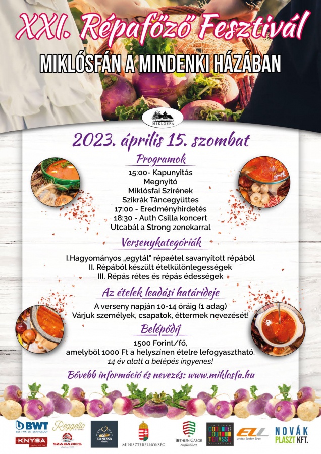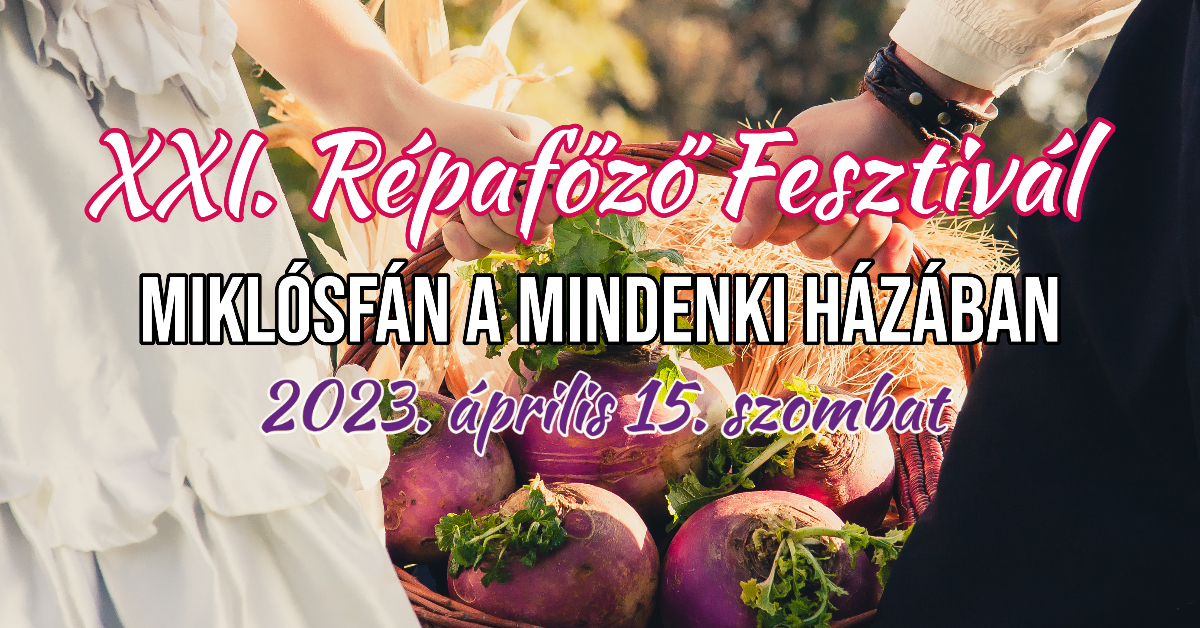 2023. április 15-én újra megrendezésre kerül az immár XXI. Répafőző Fesztivál Miklósfán. A korábbi sikerre és érdeklődésre való tekintettel a szokásostól eltérő időpontban készülhetnek a főzőcsapatok a megmérettetésre, a látogatók pedig a kóstolásra. Érdemes lesz idén is ellátogatni a rendezvényre, hisz a répás finomságok kóstolása mellett színes kulturális programok, kézműves vásár és italos büfé is várja a vendégeket.,2023. április 15-én újra megrendezésre kerül az immár XXI. Répafőző Fesztivál Miklósfán. A korábbi sikerre és érdeklődésre való tekintettel a szokásostól eltérő időpontban készülhetnek a főzőcsapatok a megmérettetésre, a látogatók pedig a kóstolásra. Érdemes lesz idén is ellátogatni a rendezvényre, hisz a répás finomságok kóstolása mellett színes kulturális programok, kézműves vásár és italos büfé is várja a vendégeket.