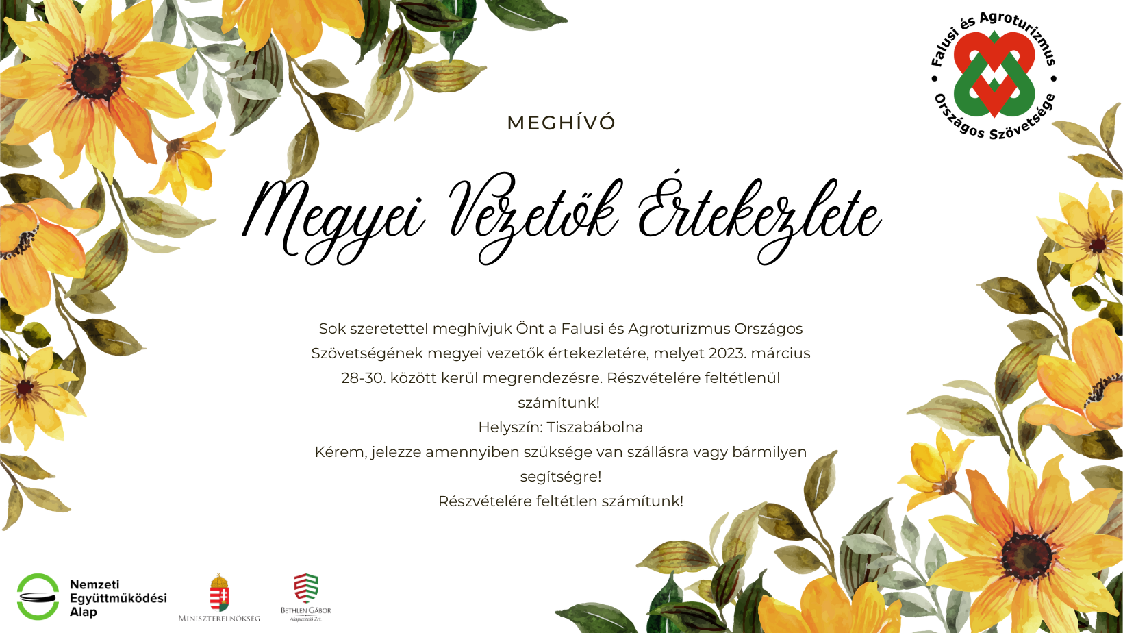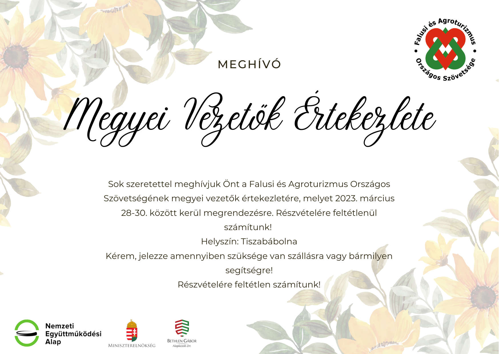 2023. március 28-30. között kerül megrendezésre a Falusi és Agroturizmus Országos Szövetségének a megyei vezetők értekezlete, amely a Borsod-Abaúj-Zemplén vármegyei Tiszabábolnán rendeznek meg.,2023. március 28-30. között kerül megrendezésre a Falusi és Agroturizmus Országos Szövetségének a megyei vezetők értekezlete, amely a Borsod-Abaúj-Zemplén vármegyei Tiszabábolnán rendeznek meg.
