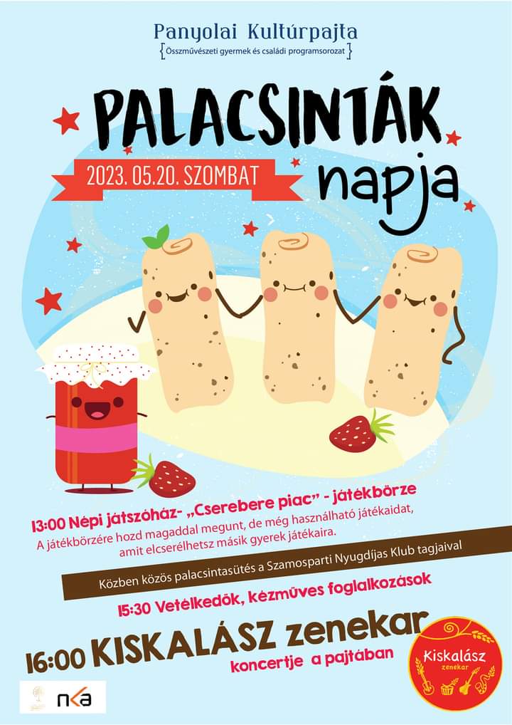 Sok szeretettel vár minden kedves érdeklődőt a Palacsinták Napja, a Panyolai Kultúrpajta szervezésében 2023. május 20-án!