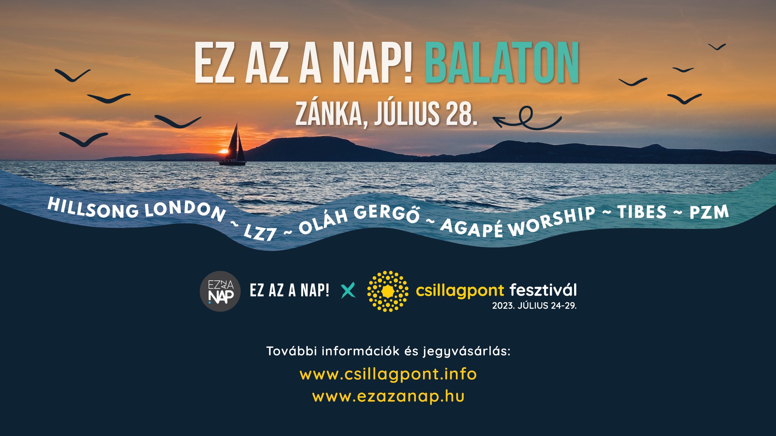 A Csillagpont fesztivál keretein belül 2023. július 28-án, Zánkán kerül sor az Ez az a nap! Balatonra a Csillagpont és az Ez az a nap! közreműködésében. A rendezvényen fellép a Hillsong London, az LZ7, az Agapé Worship, a PZM, Oláh Gergő és Tibes. Szeretettel várunk benneteket erre a napra és az egész Csillagpont fesztiválra!,A Csillagpont fesztivál keretein belül 2023. július 28-án, Zánkán kerül sor az Ez az a nap! Balatonra a Csillagpont és az Ez az a nap! közreműködésében. A rendezvényen fellép a Hillsong London, az LZ7, az Agapé Worship, a PZM, Oláh Gergő és Tibes. Szeretettel várunk benneteket erre a napra és az egész Csillagpont fesztiválra!,A Csillagpont fesztivál keretein belül 2023. július 28-án, Zánkán kerül sor az Ez az a nap! Balatonra a Csillagpont és az Ez az a nap! közreműködésében. A rendezvényen fellép a Hillsong London, az LZ7, az Agapé Worship, a PZM, Oláh Gergő és Tibes. Szeretettel várunk benneteket erre a napra és az egé