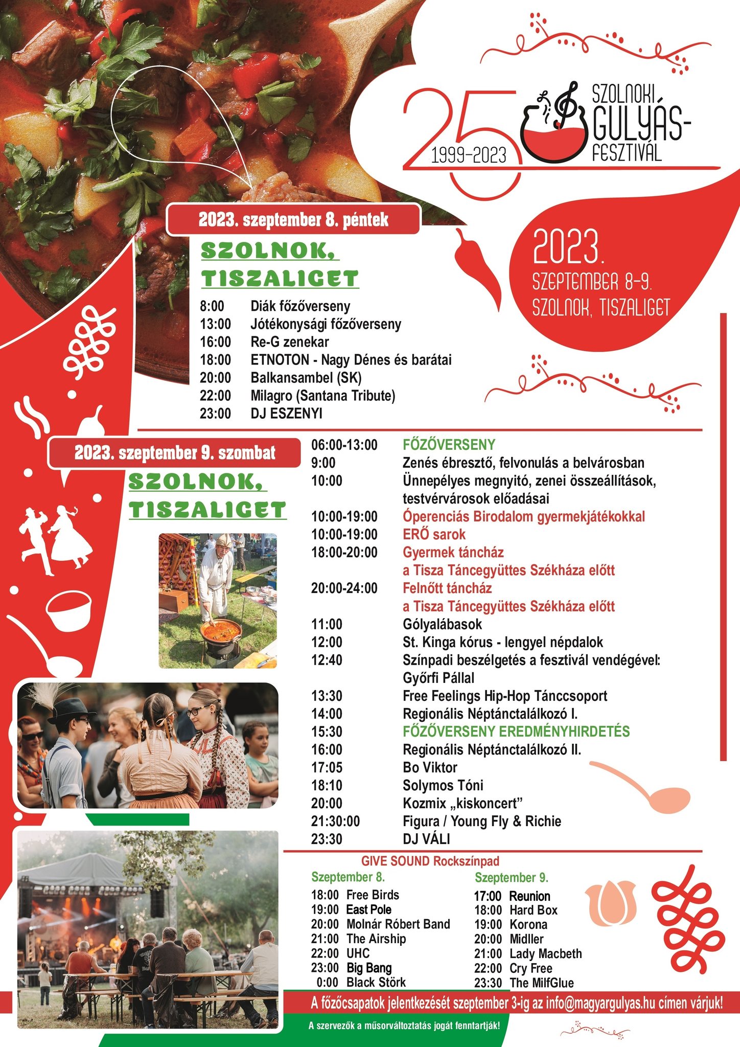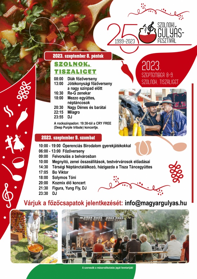 Idén 25. alkalommal kerül megrendezésre a Szolnoki Gulyásfesztivál. Most is keressük majd a Gulyáskirálynőt vagy Gulyáskirályt, aki a legfinomabb ételt rakja a zsűri elé, valamint meghirdetjük az érdekes nevű ételek főzőversenyét is és természetesen a diákok idén is együtt főznek. A nap folyamán rengeteg program és koncert is várja a fesztiválra kilátogatókat.,Idén 25. alkalommal kerül megrendezésre a Szolnoki Gulyásfesztivál. Most is keressük majd a Gulyáskirálynőt vagy Gulyáskirályt, aki a legfinomabb ételt rakja a zsűri elé, valamint meghirdetjük az érdekes nevű ételek főzőversenyét is és természetesen a diákok idén is együtt főznek. A nap folyamán rengeteg program és koncert is várja a fesztiválra kilátogatókat.,Idén 25. alkalommal kerül megrendezésre a Szolnoki Gulyásfesztivál. Most is keressük majd a Gulyáskirálynőt vagy Gulyáskirályt, aki a legfinomabb ételt rakja a zsűri elé, valamint meghirdetjük az érdekes nevű étele