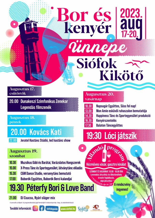 Ünnepeljük együtt az államalapítás ünnepét a Balaton legnépszerűbb városában, a nyár fővárosában: Siófokon! Hangulatos és sokszínű programmal vár mindenkit augusztus 17-20-ig a nyár fővárosa. Ünnepeljetek velünkés élvezzétek a koncerteket, előadásokat varázslatos környezetben. Több napon át szuper programok várnak benneteket: Koncertek, hastánc bemutató, gyerekprogramok, táncos produkciók, esküvői bemutató, kenyérszentelés, játszóház, gasztrokínálat és kézműves vásár. Ünnepeljünk együtt Siófokon!,Ünnepeljük együtt az államalapítás ünnepét a Balaton legnépszerűbb városában, a nyár fővárosában: Siófokon! Hangulatos és sokszínű programmal vár mindenkit augusztus 17-20-ig a nyár fővárosa. Ünnepeljetek velünkés élvezzétek a koncerteket, előadásokat varázslatos környezetben. Több napon át szuper programok várnak benneteket: Koncertek, hastánc bemutató, gyerekprogramok, táncos produkciók, esküvői bemutató, kenyérsz