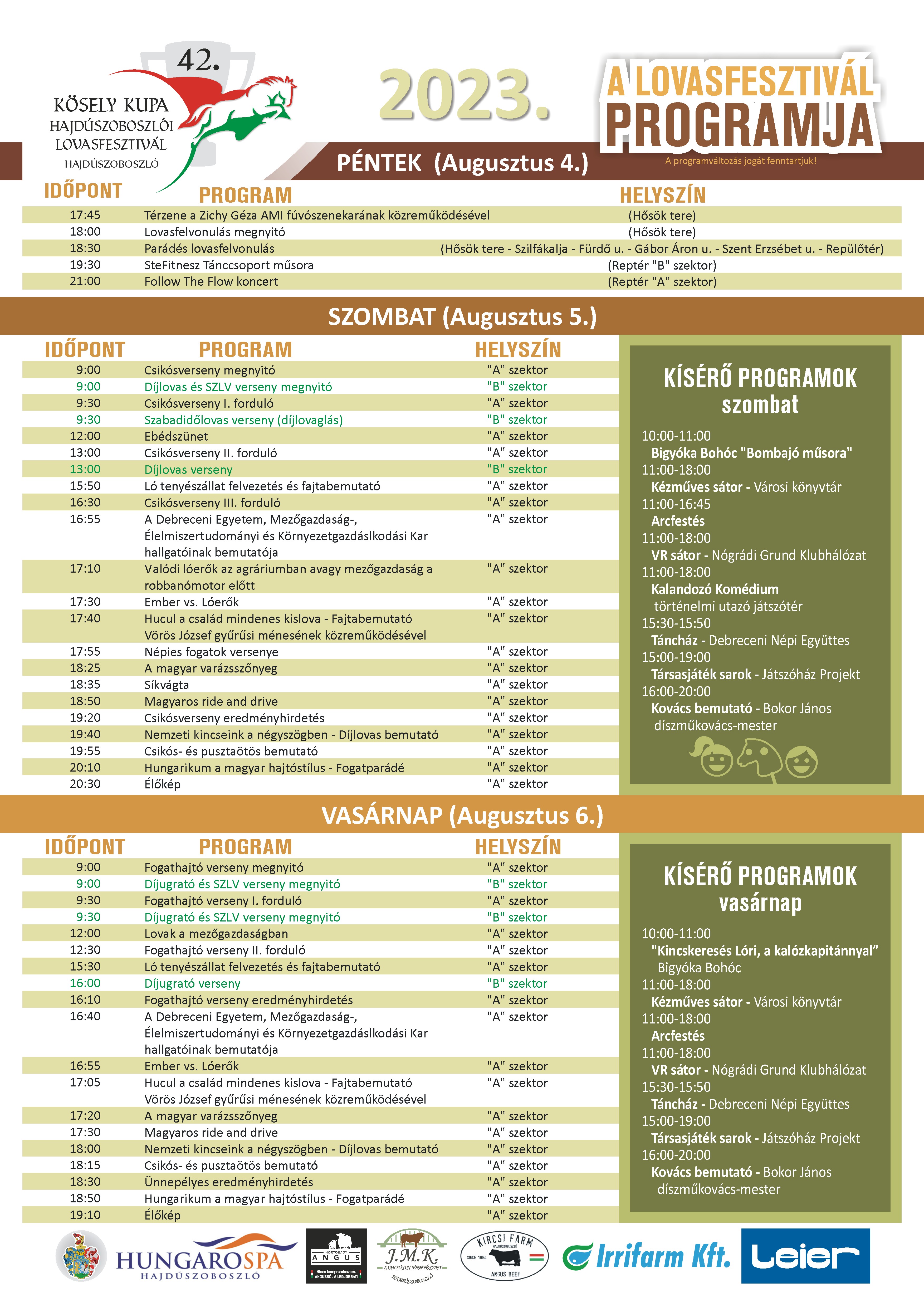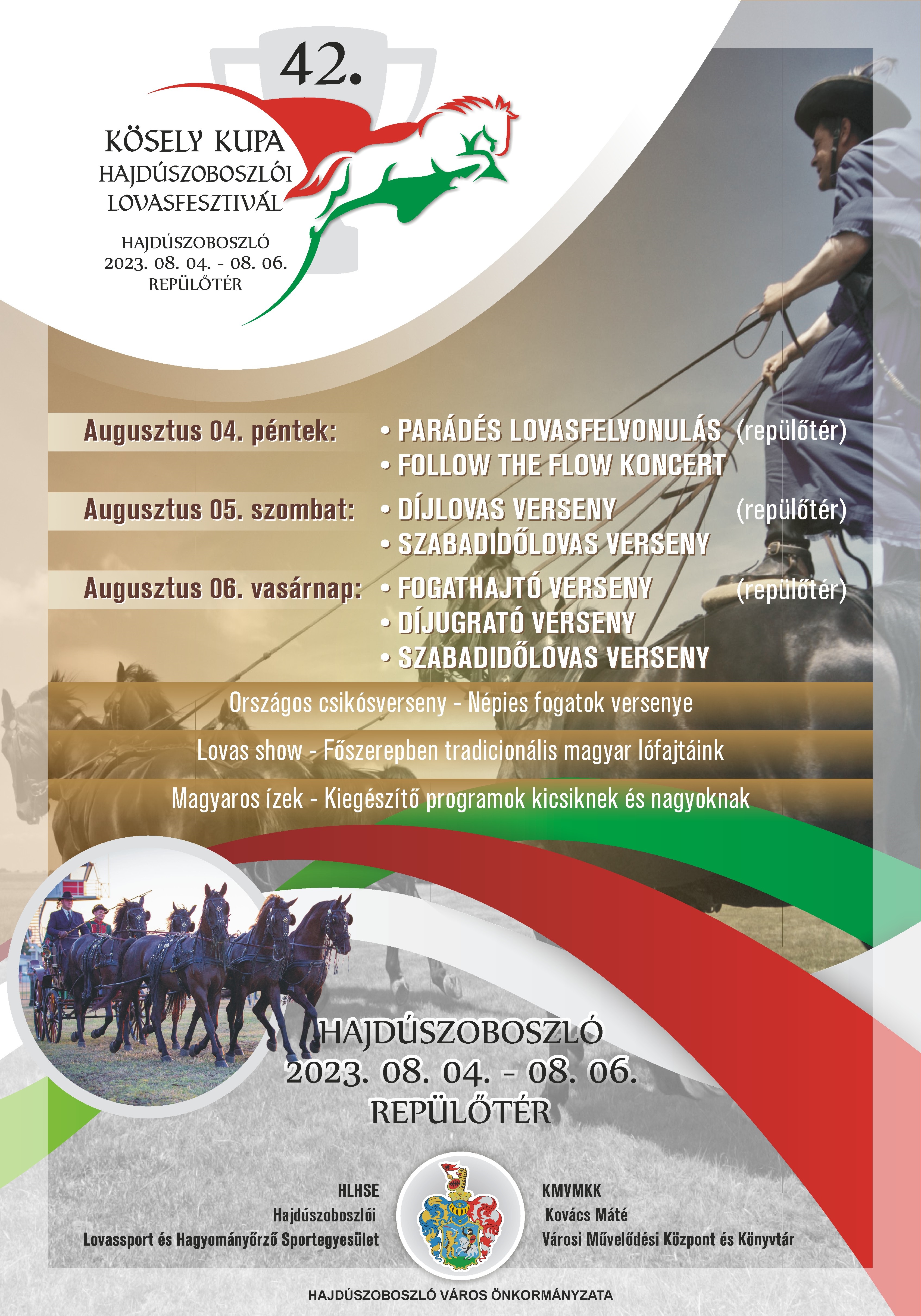 Augusztus 4-6. között jön a Tiszántúl egyik legnagyobb lovas rendezvénye, a 42. Kösely Kupa, a Hajdúszoboszlói Lovasfesztivál. Parádés lovasfelvonulás, lovas show, sőt, díjlovas, díjugrató, csikós és fogathajtó verseny várja az érdeklődőket. Péntek este fellép az ország egyik legkedveltebb zenekara, a Follow The Flow. Interaktív lovas bemutatókkal, kézműves vásárral és kifejezetten a gyerekeknek szóló programokkal készülnek a szervezők.,Augusztus 4-6. között jön a Tiszántúl egyik legnagyobb lovas rendezvénye, a 42. Kösely Kupa, a Hajdúszoboszlói Lovasfesztivál. Parádés lovasfelvonulás, lovas show, sőt, díjlovas, díjugrató, csikós és fogathajtó verseny várja az érdeklődőket. Péntek este fellép az ország egyik legkedveltebb zenekara, a Follow The Flow. Interaktív lovas bemutatókkal, kézműves vásárral és kifejezetten a gyerekeknek szóló programokkal készülnek a szervezők.,Augusztus 4-6. között jön a Tiszántúl egyik legnagyobb lova