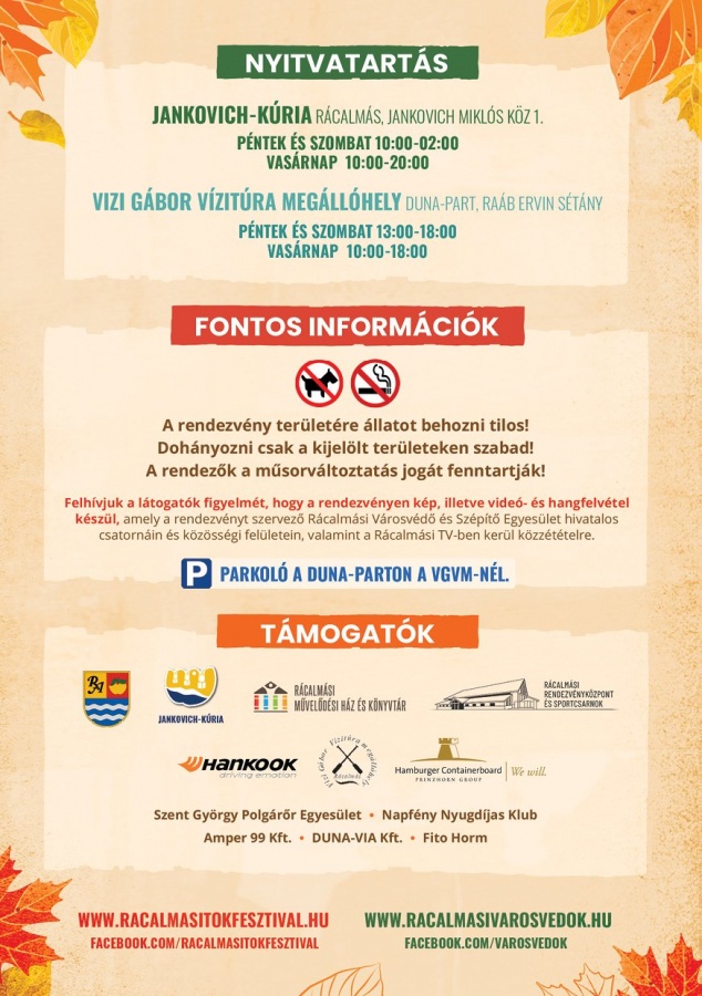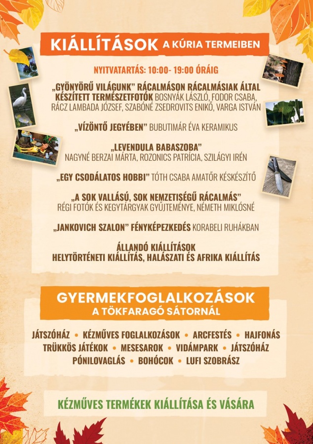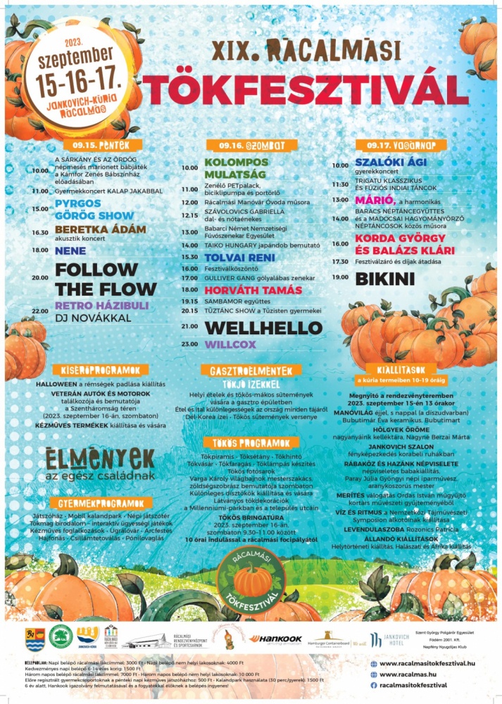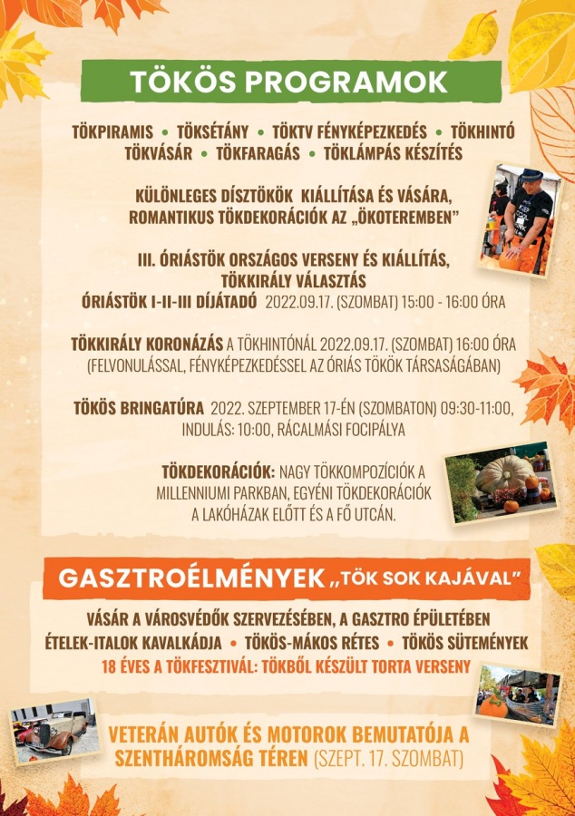 Az idei évben a Tökfesztivál szeptember 15. és 17. között kerül megrendezésre, kiváló zenei és egyéb más színes programokkal tarkítva. A Tökfesztivál remek családi program, ahol kiváló zenekarok, művészeti együttesek kínálnak színvonalas műsort az ide látogató vendégeknek, autentikus népművészek, kézművesek alkotásait csodálhatják meg, érdekes kiállításokat tekinthetnek meg, miközben a magyar és nemzetközi gasztronómia finom ételeit-italait is megkóstolhatják.,Az idei évben a Tökfesztivál szeptember 15. és 17. között kerül megrendezésre, kiváló zenei és egyéb más színes programokkal tarkítva. A Tökfesztivál remek családi program, ahol kiváló zenekarok, művészeti együttesek kínálnak színvonalas műsort az ide látogató vendégeknek, autentikus népművészek, kézművesek alkotásait csodálhatják meg, érdekes kiállításokat tekinthetnek meg, miközben a magyar és nemzetközi gasztronómia finom ételeit-italait is megkóstolhatj