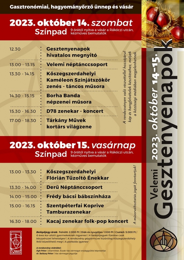A Velemi Gesztenyenapok gasztronómiai, hagyományőrző ünnep és vásár 2023. október 14-15. között lesz a Vas megyei településen. Nyílt lángon sül a gesztenye, mérik a forralt bort, kirakodóvásár és fellépők várják a vásári forgatag élményére szomjazókat.