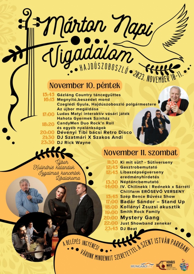 Márton-napi Vigadalom lesz 2023. november 10-11. között Hajdúszoboszlón, ahol kulináris élmények mellett zenés-táncos programokból sem lesz hiány. Márton nap alkalmából újborral és libából készült ételekkel várják a látogatókat a Márton-napi Vigadalom vendéglátói. A rendezvényen a libából készített ételek választéka mellett a magyar pincészetek újbor kínálatából is válogathatnak a látogatók. A liba napi lakoma az év záró gasztronómiai eseménye Hajdúszoboszlón, mely több zenés és kulturális programmal is szórakoztatja az érdeklődő közönséget.