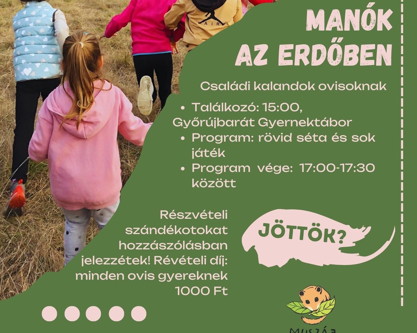 Szeretettel várnak minden ovis Manót és családját erdei kalandozásunkra! A rövid túrát játékkal, természetismereti feladatokkal teszik izgalmassá. Mi történik tavasszal? Mit csinálnak az állatok? Felfedezik ilyenkor mi történik a természetben.