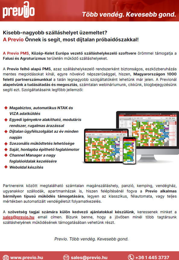 A Szövetség tagjai számára külön kedvező ajánlatokkal készülünk, keressenek minket a sales@previo.hu email címen. Bízunk benne, hogy a jövőben minél több tagtársunk szálláshelyének működésének támogatásában vehetünk részt.