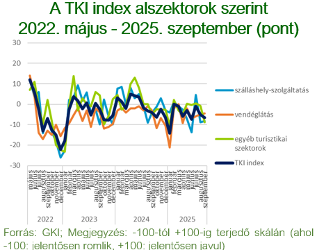 Amennyiben a 2025. szeptemberi TKI indexet összevetjük az egy évvel korábbival (2024. szeptember), 3 pontos csökkenést tapasztalunk. Az alszektorok közül éves összehasonlításban mindhárom konjunktúrája romlott, a szálláshely-szolgáltatásé és az egyéb turisztikai szektoré 4-4 ponttal, míg a vendéglátásé 1 ponttal.