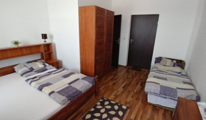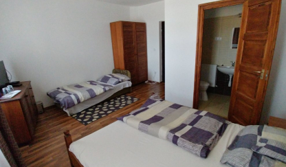 Vendégházunkban 4 darab elegáns belső kialakítású, franciaágyas szoba található, amelyek összesen 12 férőhelyet biztosítanak. Mindegyik szoba saját fürdőszobával rendelkezik, melyekben az önálló zuhanyzó és toalett egyaránt megtalálható. Rendelkezünk egy közös konyhával és egy közösségi térrel, amely étkezőként és nappaliként is szolgál. A nappali részben helyet kapott egy gyermek játszósarok is. Szobáink igényes, modern bútorokkal vannak felszerelve és minden szobánk rendelkezik egy síkképernyős LED tv-vel.