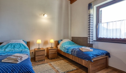 II. vendégház: Közvetlen kertkapcsolattal és dupla kézmosós zuhanyzóval, légkondícionálóval, külön wc-vel rendelkező falusi stílusben berndezett vendégház két szobája franciaággyal, illetve 2 db egyszemélyes ággyal került berendezésre. A nappaliban található kihúzható kényelmes kanapé további két fő elhelyezését teszi lehetővé.