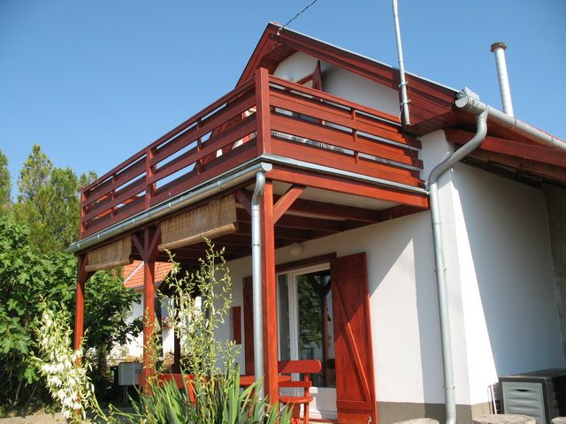 A különálló összkomfortos vendégház egy 1000m2-es zárt udvarban áll. 4 fő számára ideális, de 6 fő is kényelmesen elfér benne. A földszinten étkező-konyha-nappali és a tusoló-WC található, a légkondicionált tetőtérbe “pingvinlépcső” vezet, itt található a 2 hálószoba. A konyha jól felszerelt, önellátásra alkalmas. Vízforralóval, kenyérpirítóval, kávéfőzővel, mikroval és egyéb konyhai eszközökkel várja a vendégeket. Pici gyermekkel érkezők számára rendelkezésre áll kiságy, etetőszék és fürdetőkád is, a nagyobbacskák számára pedig néhány kerti játék. A szabadtéri sütéshez-főzéshez grillező és bogrács is igénybevehető.
