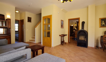 A közös helyiségek, mint a teljes körűen felszerelt konyha és a kandalló melegével áthatott, tágas társalgó rendkívül ideális kellemes családi, baráti összejövetelekre. A vidéki hangulatot idéző kiegészítők, a bontott téglából épített bárpult, a közeli dombokra néző ablakocskák pedig garantálják a tökéletes kikapcsolódást.