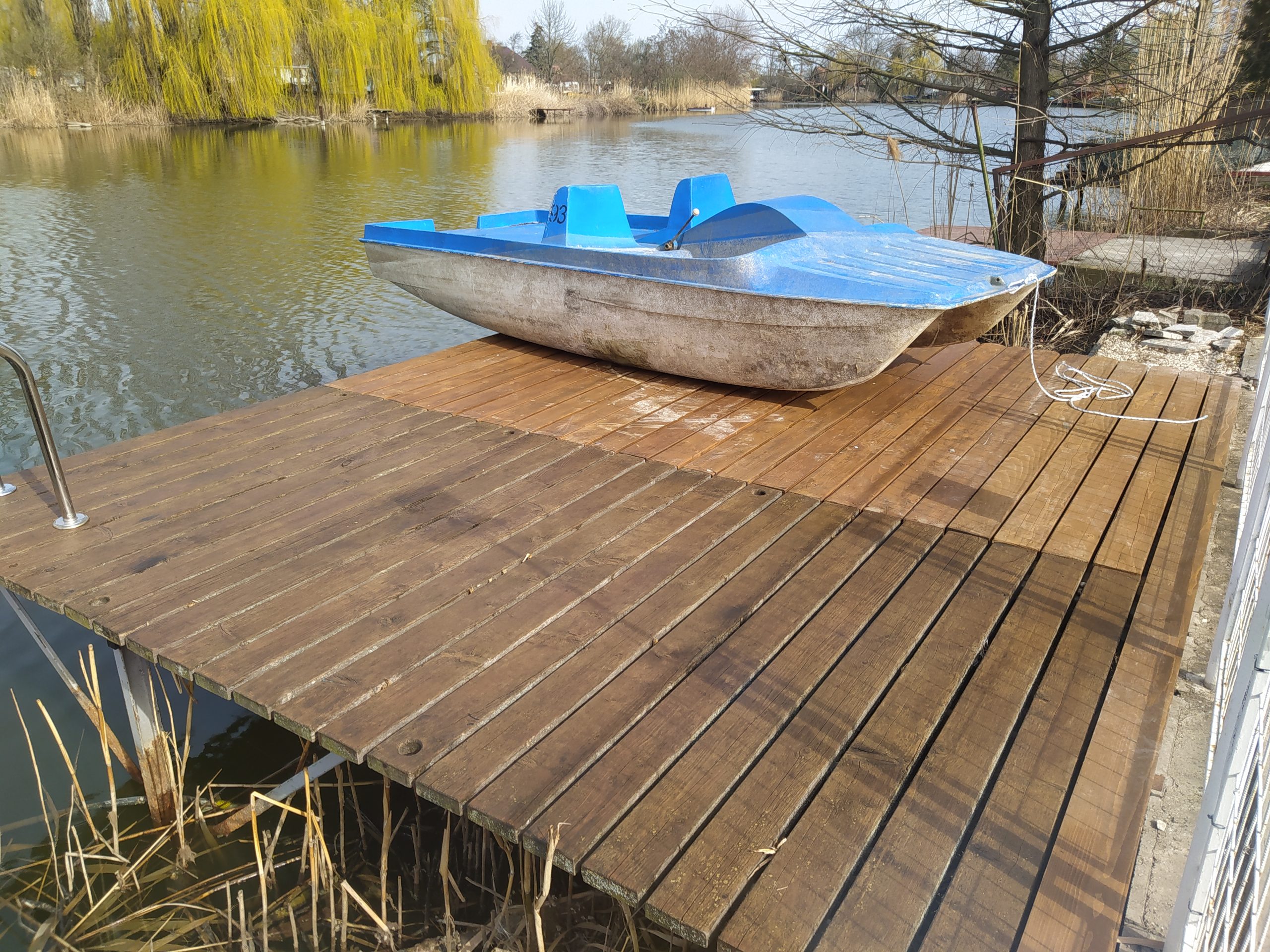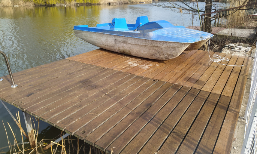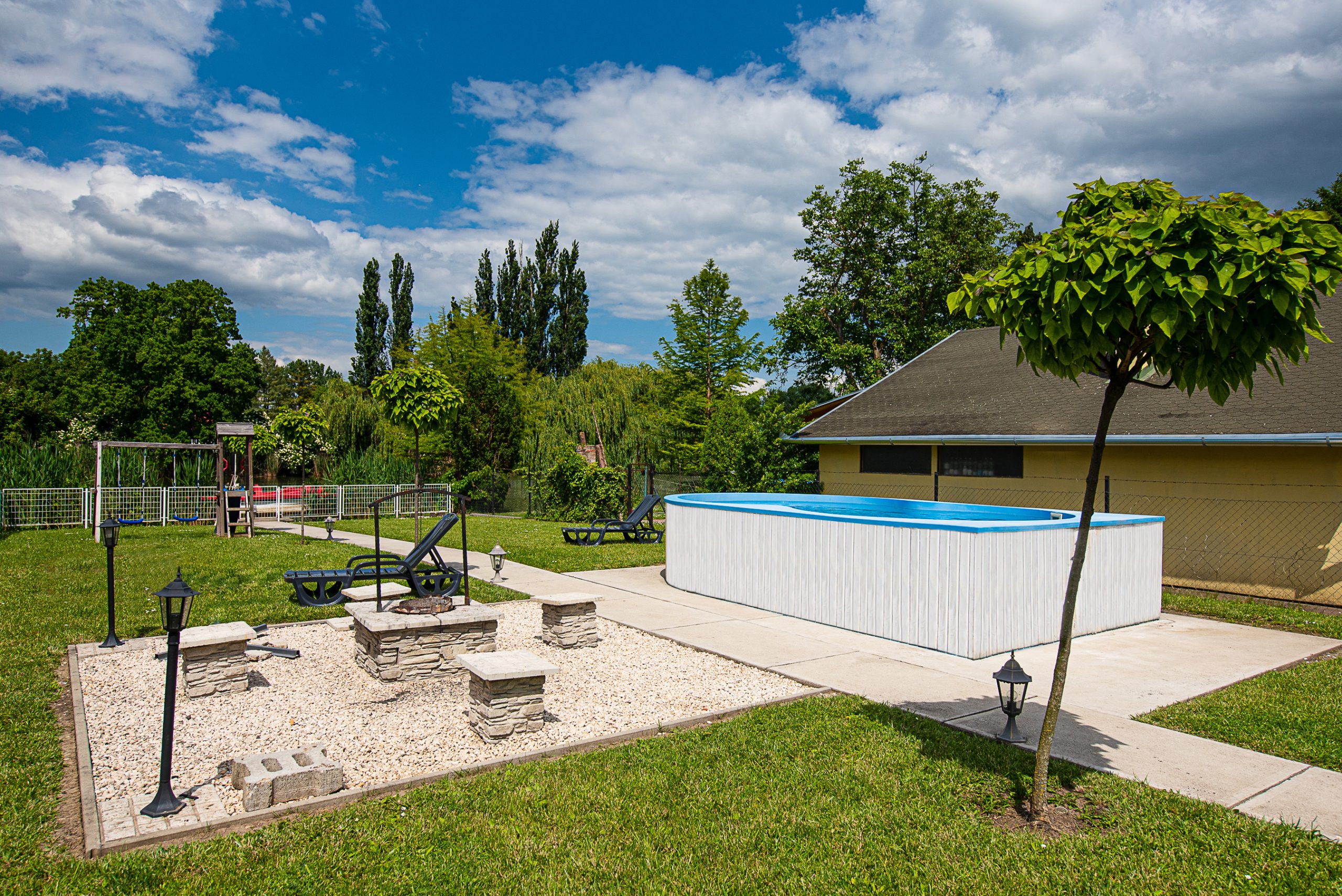 A vízpart felől egy hangulatos, fedett terasz nyílik, kényelmes kerti bútorokkal. A zárt udvarban föld feletti medence, hatfős jakuzzi és egy fából készült játszótér gondoskodik a szórakozásról, míg a bográcsozóhely kellemes esti sütögetések helyszíne lehet. A vízparton saját stég, csónak, vízibicikli és parti világítás teszi teljessé a kikapcsolódás élményét.