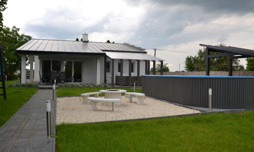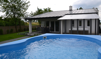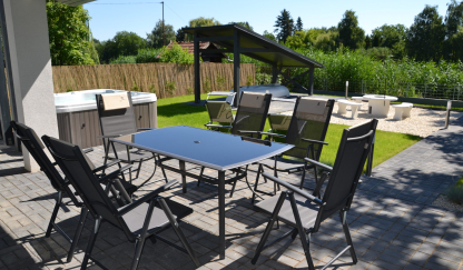A nyaraló téliesített, hőszigetelt, fűtőpanelekkel és kandallóval is fűthető, így egész évben kellemes hőmérsékletet biztosít. A zárt udvar szórakozási lehetőségekben is bővelkedik: föld feletti medence, öt személyes jakuzzi, fából készült játszótér és bográcsozó áll a vendégek rendelkezésére. A vízparton egy nagyméretű stég, csónak, vízibicikli és parti világítás teszi teljessé a kikapcsolódást. A vendégház jó minőségű vezetékes ivóvízzel és Wi-Fi-vel felszerelt.