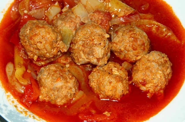 Egy másik lábasban a szálasra vágott vöröshagymát zsíron megpároljuk. Ráhelyezzük a hústekercseket, kevés majoránnával megszórjuk, és fedő alatt húsz perc alatt készre főzzük.