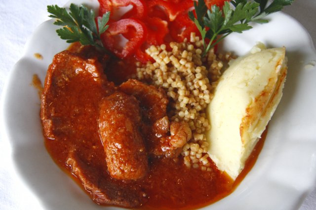 Hozzávalók: 30 kis szelet marha fehérpecsenye, só, 2 dl étolaj a sütéshez, 50 dkg vöröshagyma, 1 fakanál sertészsír, 1 kávéskanál majoránna. Töltelék: 1 kg darált sertéshús, 4 szelet szikkadt kenyér, 2 tojás, 2 vöröshagyma, só, őrölt feketebors. Kása: 1 kg köles, 40 dkg aszalt szilva, só, 2 dl étolaj, 2 evőkanál cukor, 1 kávéskanál őrölt fahéj, vörösbor, 10 szem szegfűszeg.