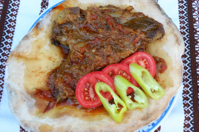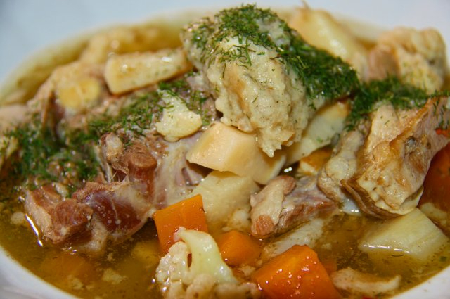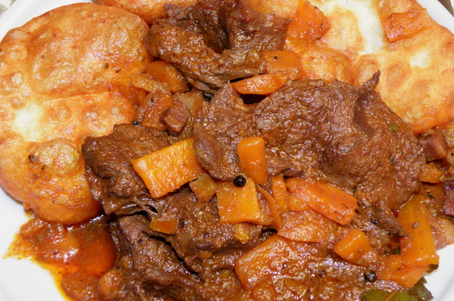 Hozzávalók: 60 dkg marha fehérpecsenye, 1 vöröshagyma, 1 dkg őrölt paprika, só, őrölt feketebors, 5 dkg zsír, 1 paprika, 1 paradicsom. A gombóchoz: 40 dkg burgonya, 1 vöröshagyma, 20 dkg liszt, 2 tojás, 3 evőkanál tejföl, kis csokor petrezselyemzöld, só, 3 dkg zsír, 1 teáskanál őrölt paprika.