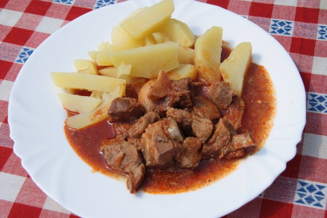 Hozzávalók: (15 főre) 8,5 kg birkahús: csontos és húsos vegyesen, 85 dkg vöröshagyma, 1 fej fokhagyma, 10 dkg kacsazsír, 3 db paprika, 3 paradicsom, 10 dkg só, 5 ág rozmaring, 1 evőkanál majoránna, 2 teáskanál kakukkfű, 1,5 dkg őrölt bors, 5 evőkanál őrölt paprika, 2 csípős zöldpaprika, 3 dl fehérbor.