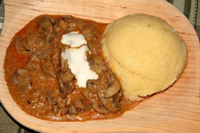 Hozzávalók: 80 dkg gomba, 1,5 dl főzőtejszín, 1 teáskanál kakukkfű, 1 kávéskanál őrölt feketebors, 0,5 dl étolaj, 2 vöröshagyma, 2 csapott evőkanál őrölt paprika, 1 teáskanál só, 1 babérlevél. A puliszkához: 20 dkg kukoricadara, 1 teáskanál só.