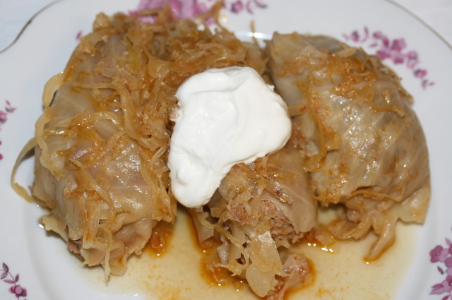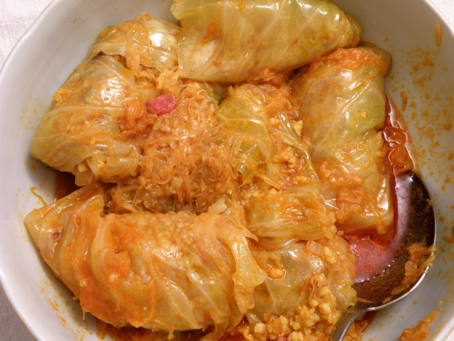 Egy nagy fazék alját beborítjuk a vágott káposzta felével. A leveleket lazán megtöltjük kásás-sonkás-fűszeres keverékkel úgy, hogy egyik végét behajtjuk, és kis távolságokat hagyva egyenként az edénybe helyezzük. Amikor az összes levelet megtöltöttük, a tetejére tesszük a maradék vágott káposztát, és a szalonna bőrét, felöntjük annyi vízzel, hogy teljesen ellepje az egészet, és lassú tűzön kb. másfél óráig főzzük.